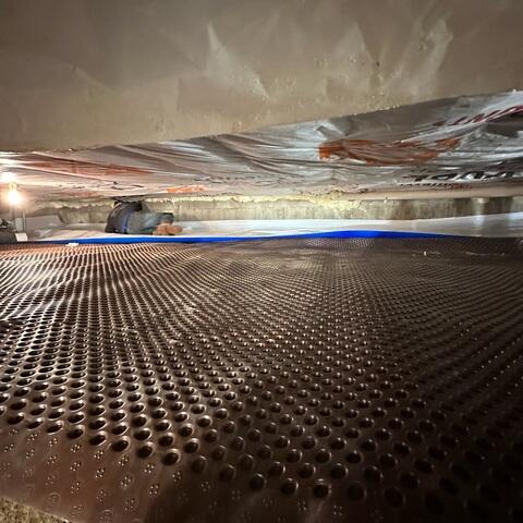 Our experienced production team began by installing CleanSpace® drainage matting across the crawl space's dirt floor. This crucial first step ensured effective water drainage beneath the subsequent encapsulation. Next, the team installed our robust CleanSpace® liner to completely encapsulate the crawl space, creating a powerful barrier against moisture intrusion and significantly reducing humidity levels.